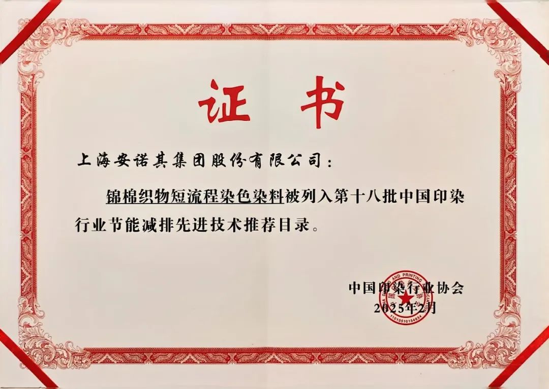 安诺其锦棉织物短流程染色染料已形成覆盖“安诺门红玉 NC”、“安诺门藏青 NC”、“安诺门黄棕 NC”、“安诺门黑 NC”的专利产品矩阵,核心技术获4项国家发明专利授权,并通过上海市高新技术成果转化认定。
