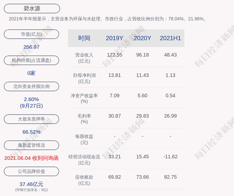 2021年半年报显示,碧水源的主营业务为环保与水处理、市政行业,占营收比例分别为:78.04%、21.96%。