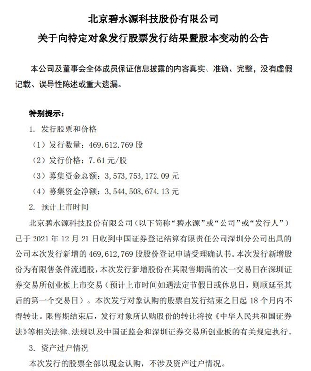 北京碧水源科技股份有限公司(下称“公司”)已于 2021 年 12 月 21 日收到中国证券登记结算有限责任公司深圳分公司出具的公司本次发行新增的 469,612,769 股股份登记申请受理确认书。