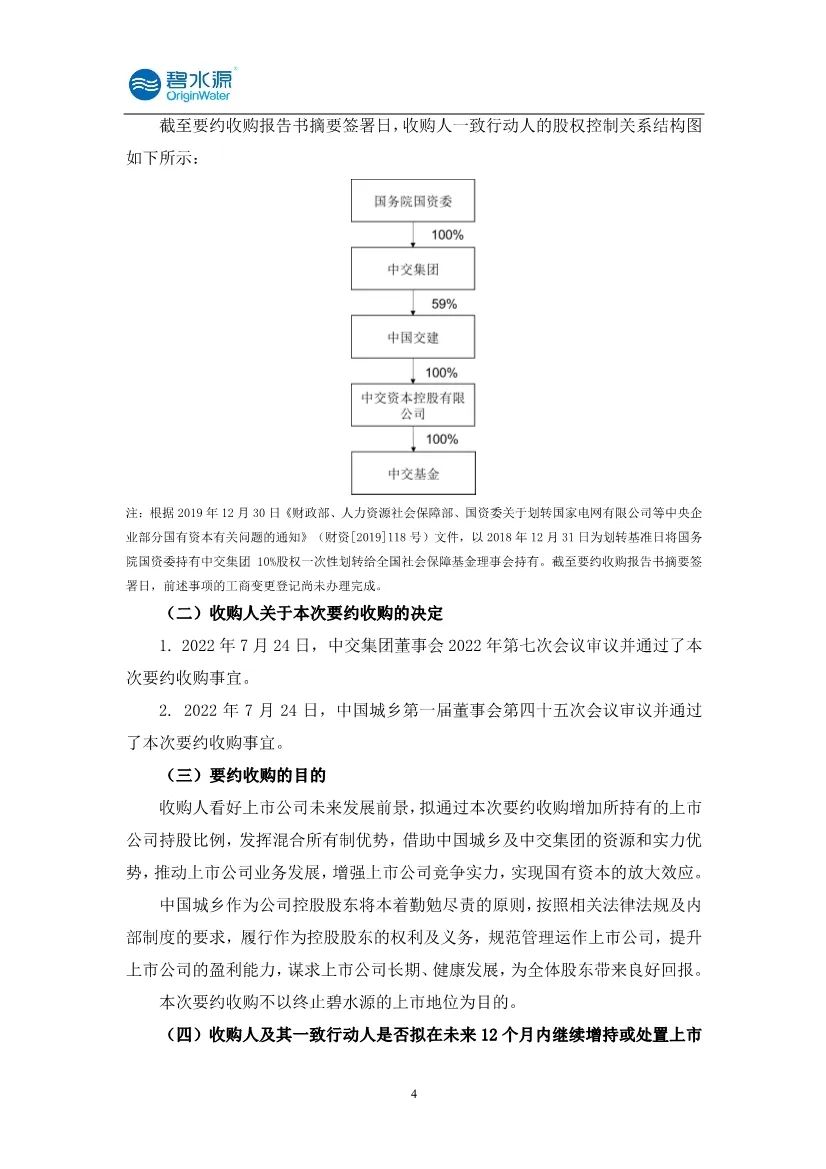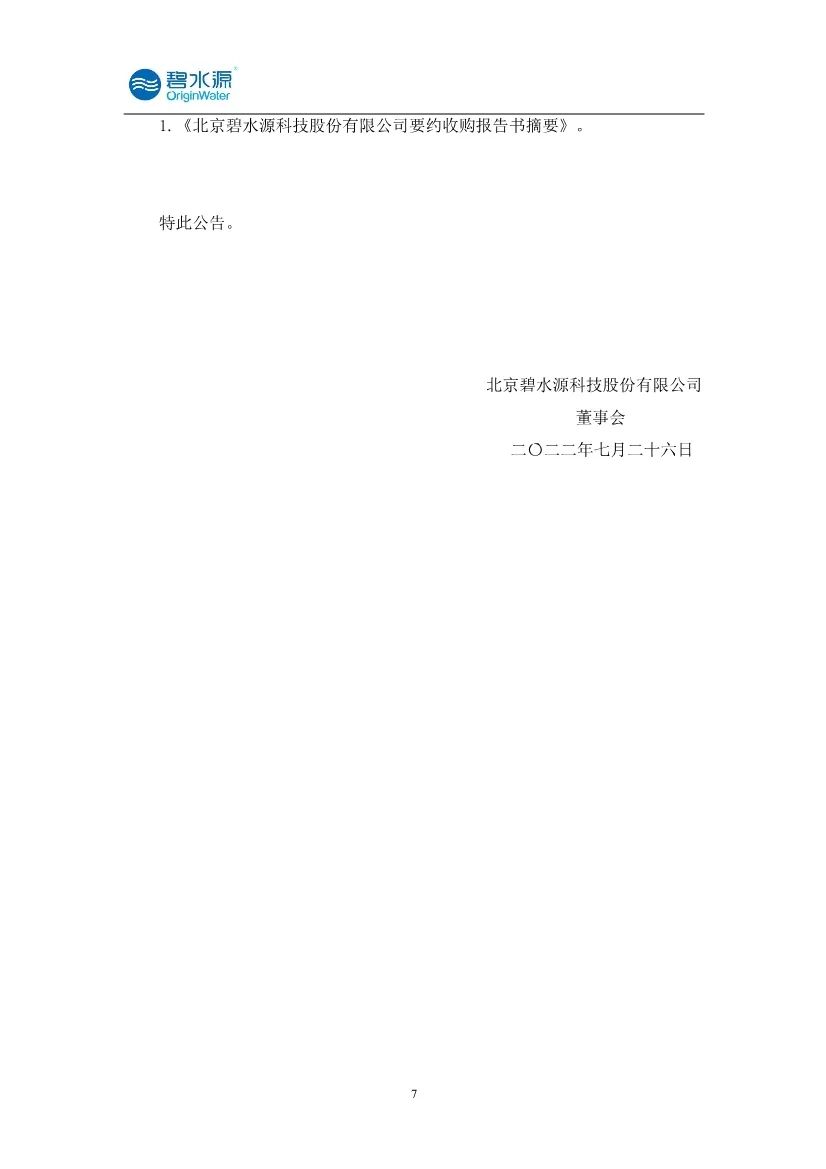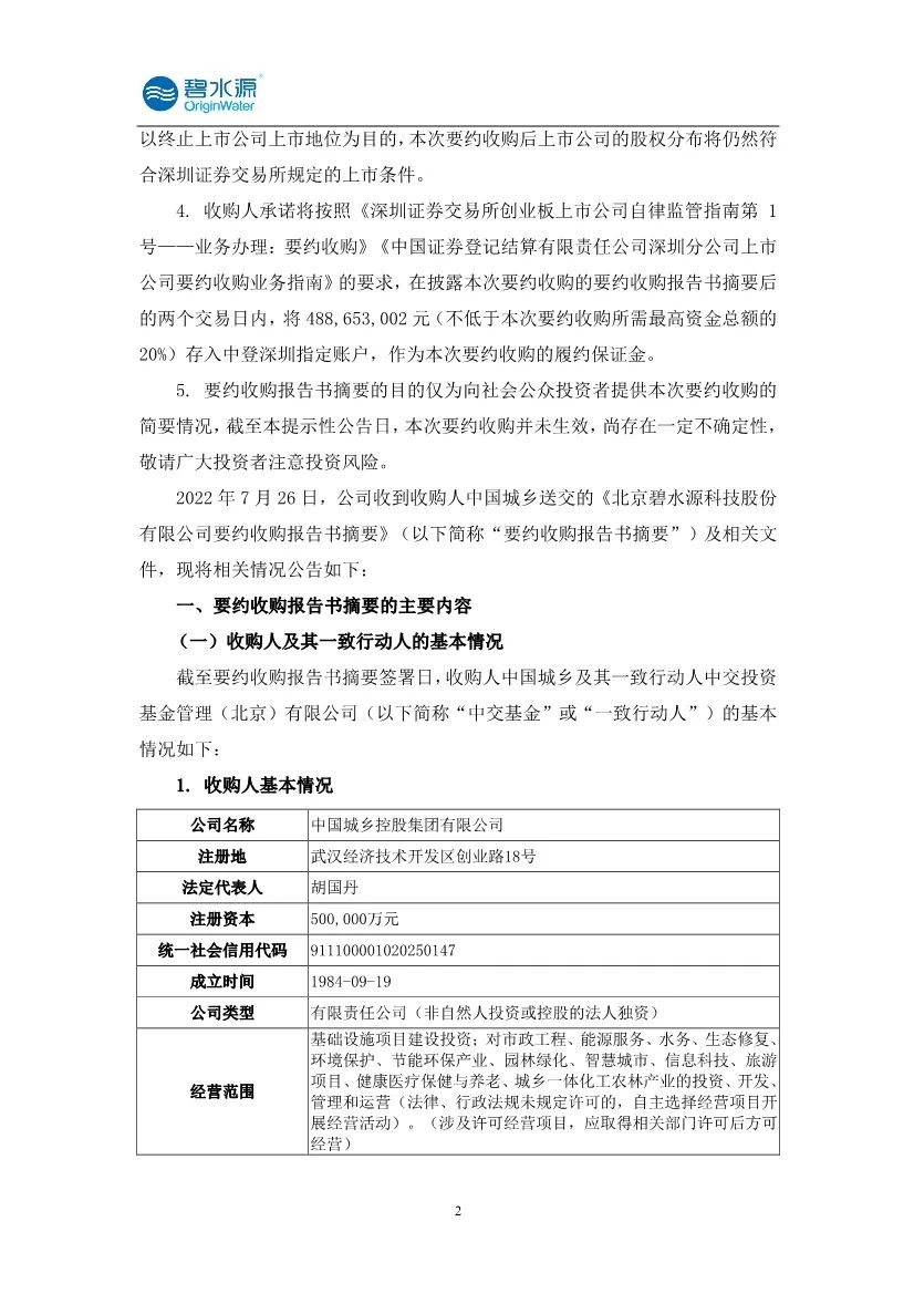 7月26日,碧水源发布公告,2022 年 7 月 26 日,公司收到收购人中国城乡送交的《北京碧水源科技股份有限公司要约收购报告书摘要》,本次要约收购为收购人向除收购人及其一致行动人以外的碧水源全体股东发出的部分要约收购,要约价格为 6.00 元/股,要约收购股份数量为4.07亿股,占总股本比例11.24%。
