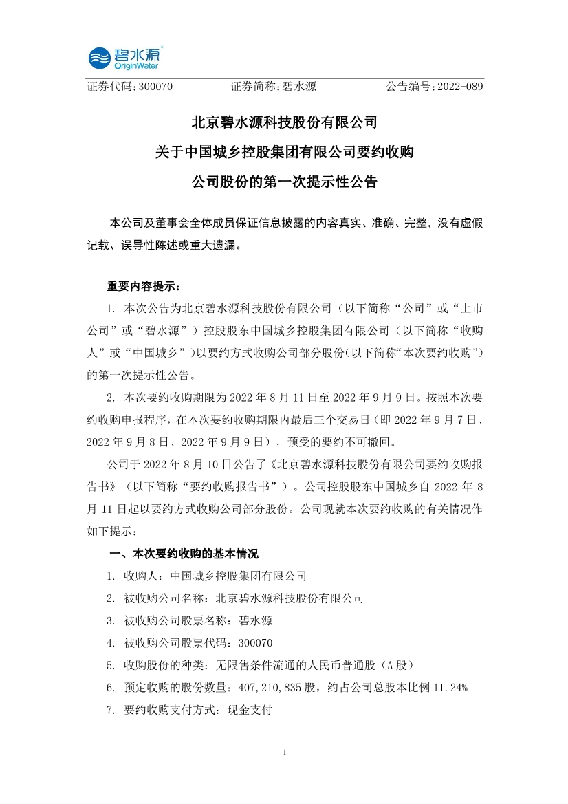8月10日,碧水源发布关于中国城乡控股集团有限公司要约收购公司股份的第一次提示性公告,本次公告为碧水源控股股东中国城乡控股集团有限公司以要约方式收购公司部分股份的第一次提示性公告。