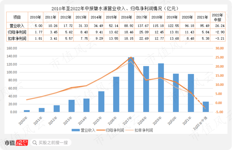 2021年,碧水源扣非净利润在前一年8.5亿元的基础上再次下滑31%,至5.84亿元,与业绩承诺的下限15.88亿元,相差10亿元。