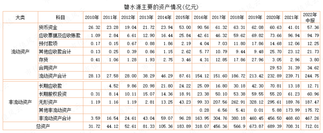 话说,碧水源上市后可谓如鱼得水,营收、总资产不断增长。2010年流动资产、非流动资产分别仅为28亿元、3.6亿元,到2022年上半年二者分别达244.8亿元、467亿元,分别增长了8倍、129倍。