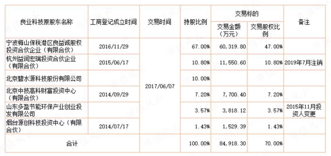 2018年12月,上市公司再次以现金3.85亿元收购宁波良益诚持有的目标公司10.01%;此时,良业环境100%股权对应的估值飙升至38.5亿元,较1年半前增长了260%。交易完成后,碧水源持有良业环境90.01%股权。