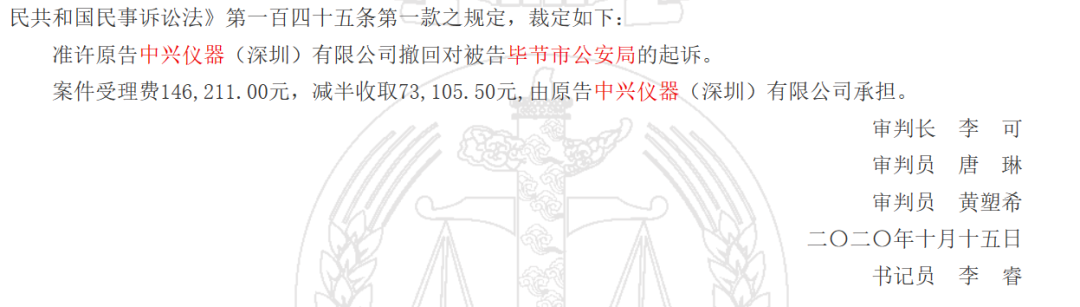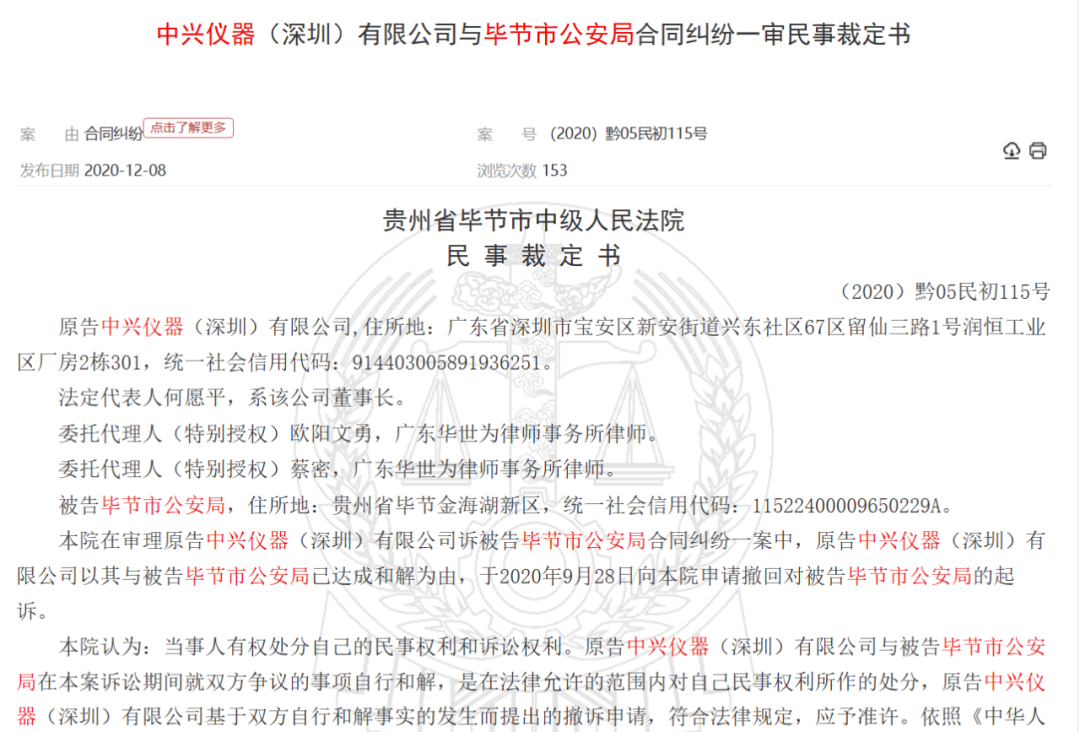 中国裁判文书网2020年12月8日上传的一份毕节市中级法院《民事裁定书》显示:发行人前身中兴仪器(深圳)有限公司曾以合同纠纷为由起诉毕节市公安局。后以达成和解为由,中兴仪器于2020年9月28日向法院申请撤回对被告毕节市公安局的起诉。案件受理费146211元,减半收取,由原告中兴仪器(深圳)有限公司承担。