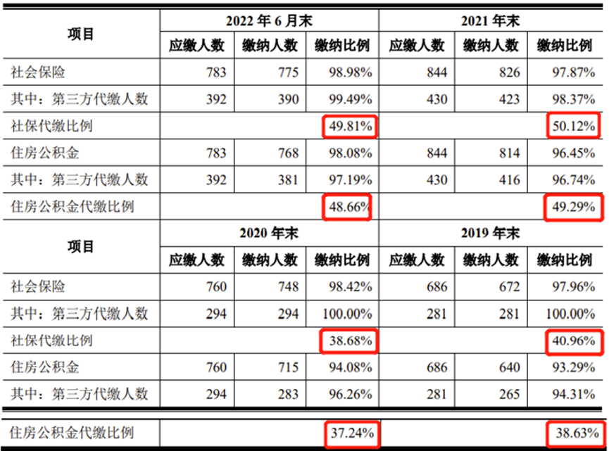 报告期,公司运营项目较多,且覆盖区域较广。部分员工因为社会保险和住房公积金难以跨省市使用的问题不愿意在本部或者下属子公司缴纳社保和公积金,因此为保障员工权益、便于员工管理、减少员工流失的风险,公司委托有资质的第三方按照政府规定的政策在当地为运营项目现场员工(主要为属地员工)缴纳社保和公积金。2019年末、2020年末、2021年末及2022年末,社保代缴的员工比例分别为40.96%、38.68%、50.12%及49.81%;住房公积金代缴的员工比例分别为38.63%、37.24%、49.29%及48.66%。