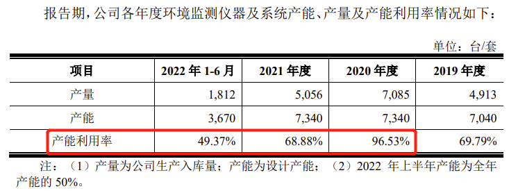 2020年、2021年、2020年上半年产能没有变化,但产能利用率从2020年度的96.53%,大幅下降到2021年的68.88%,2022年上半年进一步下降到49.37%。