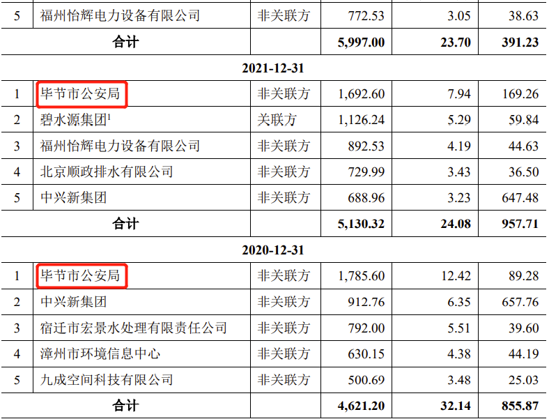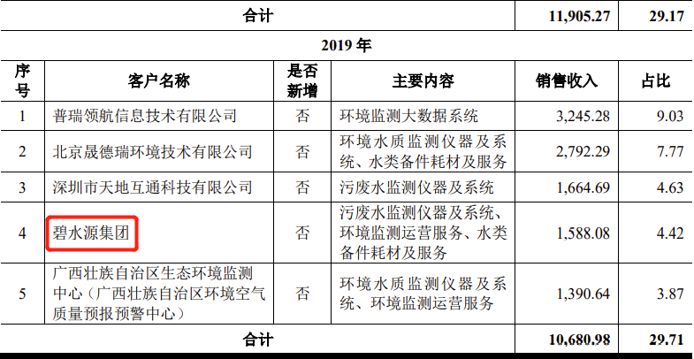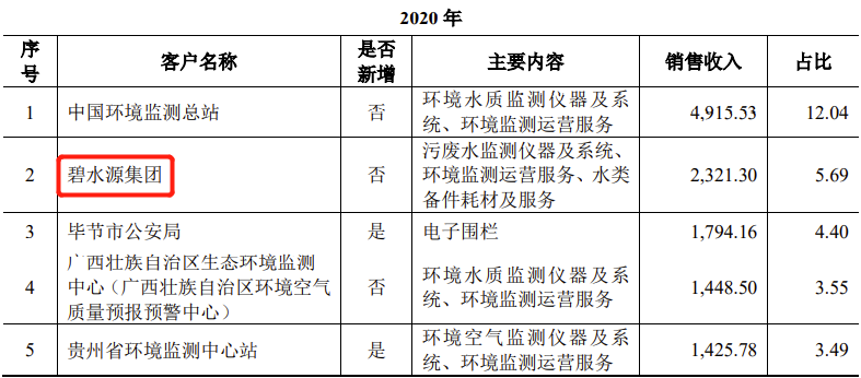 2019年、2020年、2021年及2022年上半年,碧水源分别是公司第4、第2、第1及第4大客户,为公司贡献收入的比例分别为4.42%、5.69%、7.30%及5.31%。