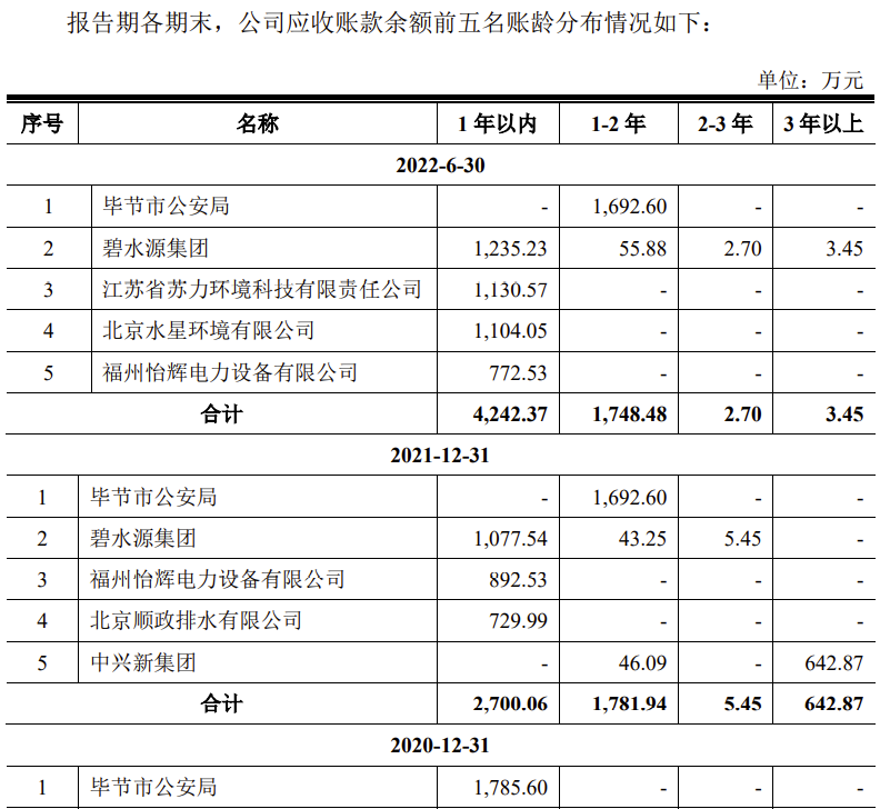 各报告期末,发行人2年以上的应收账款金额较大。2020年末、2021年末、2022年6月末,应收账款第一名都是贵州省的毕节市公安局,金额分别是1785.60万元、1692.60万元、1692.60万元。