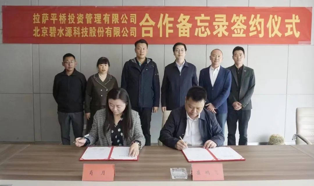 碧水源高级副总裁崔鹏飞和拉萨平桥投资管理有限公司副总经理肖月代表双方签署合作备忘录,黄江龙和公古赛秋作为见证人,见证了此次合作备忘录的签署。