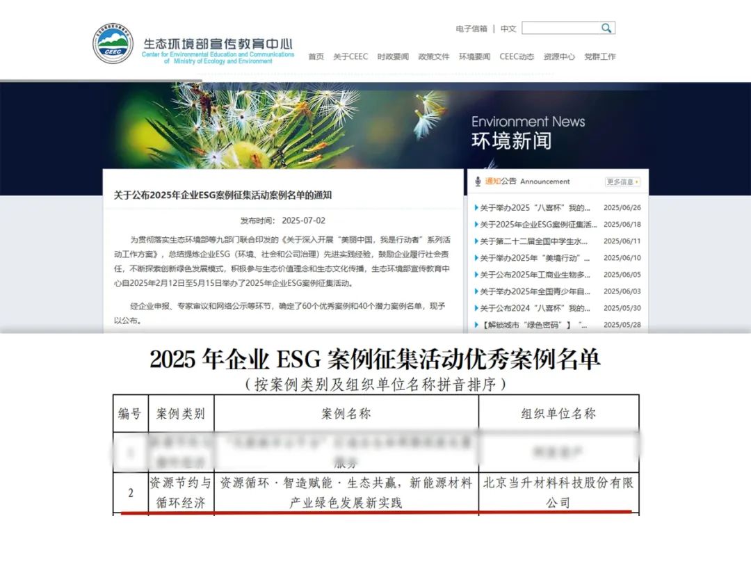 近日,国家生态环境部在2025年生态文明贵阳国际论坛上,发布“2025年企业ESG优秀案例”,当升科技成功入选ESG优秀案例名单,是锂离子电池材料行业的唯一上榜企业。