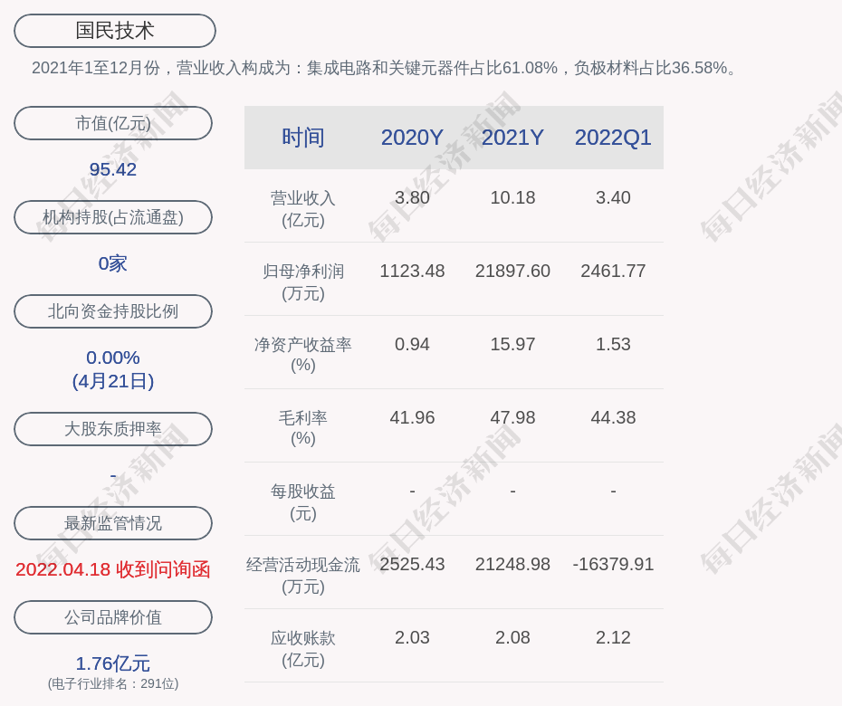 2021年1至12月份,国民技术的营业收入构成为:集成电路和关键元器件占比61.08%,负极材料占比36.58%。
