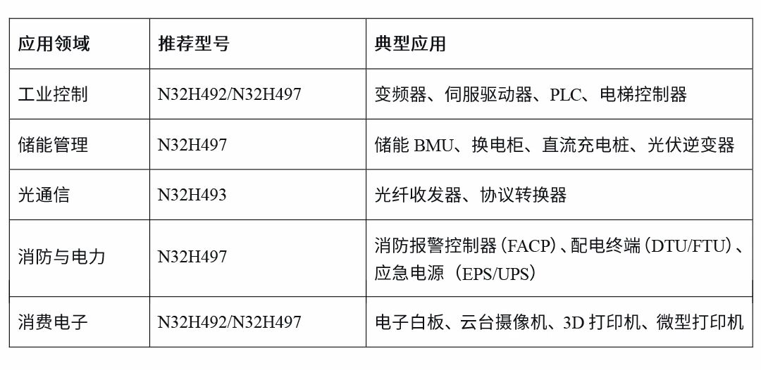 根据应用场景对性能、存储与接口的差异化需求,N32H49x系列为不同行业提供了极具针对性的芯片选择。