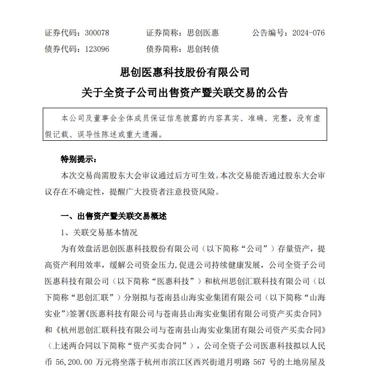 此前思创医惠发布公告称,全资子公司医惠科技拟以5.62亿元将滨江区医惠中心出售给山海实业,全资子公司思创汇联拟以2.38亿元将临平区厂房出售给山海实业,合计作价8亿元。此举目的是有效盘活思创医惠存量资产,提高资产利用效率,缓解思创医惠资金压力,促进思创医惠持续健康发展。