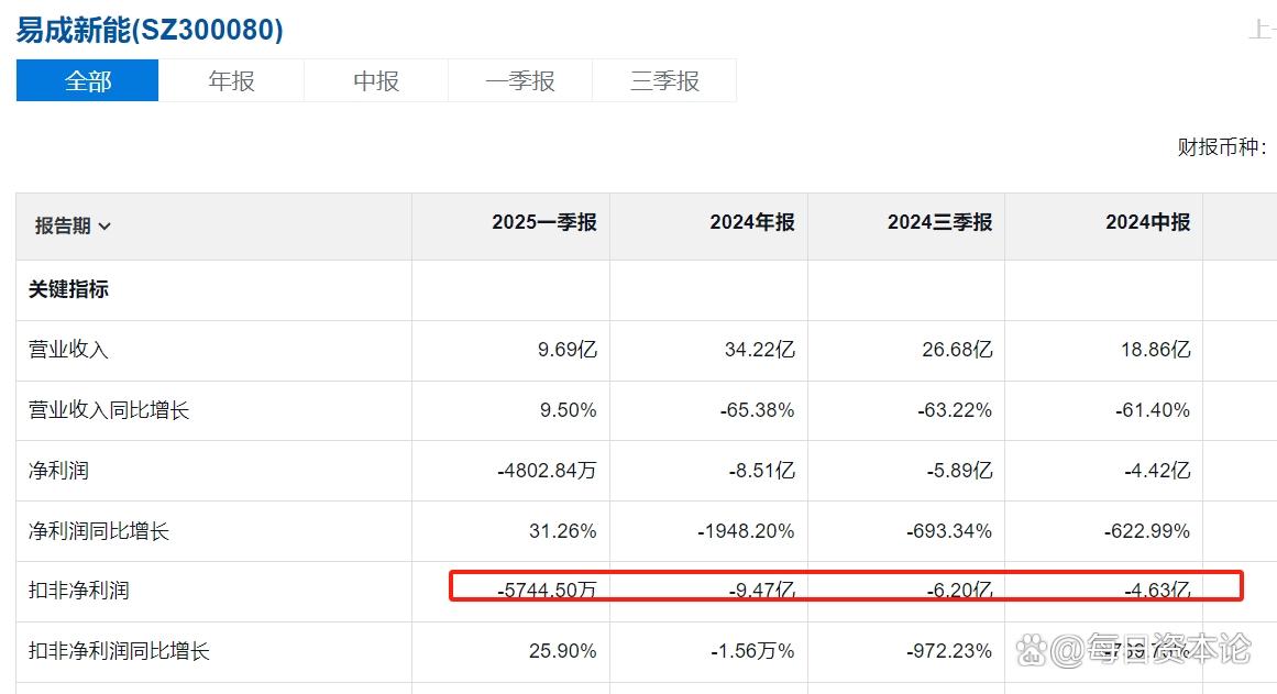 易成新能财报显示,2024年,其营收34.22亿元,同比大跌65.38%;净利润巨亏8.51亿元,同比暴跌1948.20%;扣非净利润亏损9.47亿元,下滑幅度触目惊心地达到15588.43%。进入2025年第一季度,亏损仍在持续,归母净利润为-4802.84万元。