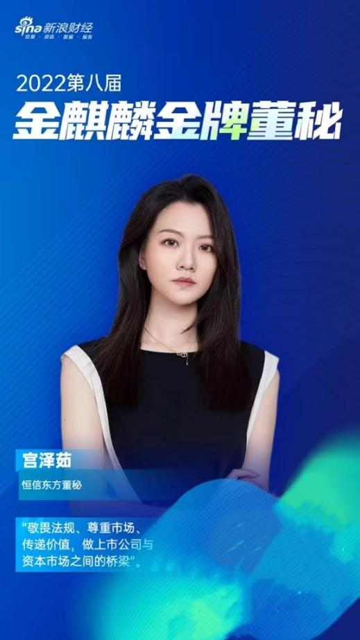 近日,由新浪财经主办的中国碳中和峰会暨第八届金麒麟金牌董秘盛典隆重召开,恒信东方(300081.SZ)董事会秘书宫泽茹荣获新浪财经第八届金麒麟金牌董秘荣誉,体现了对其工作的认可。宫泽茹认为,敬畏法规、尊重市场、传递价值,做上市公司与资本市场之间的桥梁,是董秘最重要的准则之一。