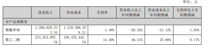 2024上半年,公司聚醚单体产品的营业收入为12.01亿元,同比减少20.32%;营业成本为12.18亿元,同比减少21.12%;毛利率-1.48%,比上年同期增加1.03%。聚乙二醇产品的营业收入为2.31亿元,同比增加26.21%;营业成本为1.95亿元,同比增加25.96%;毛利率15.40%,同比增加0.17%。两个主要产品毛利率均不同程度得到改善。