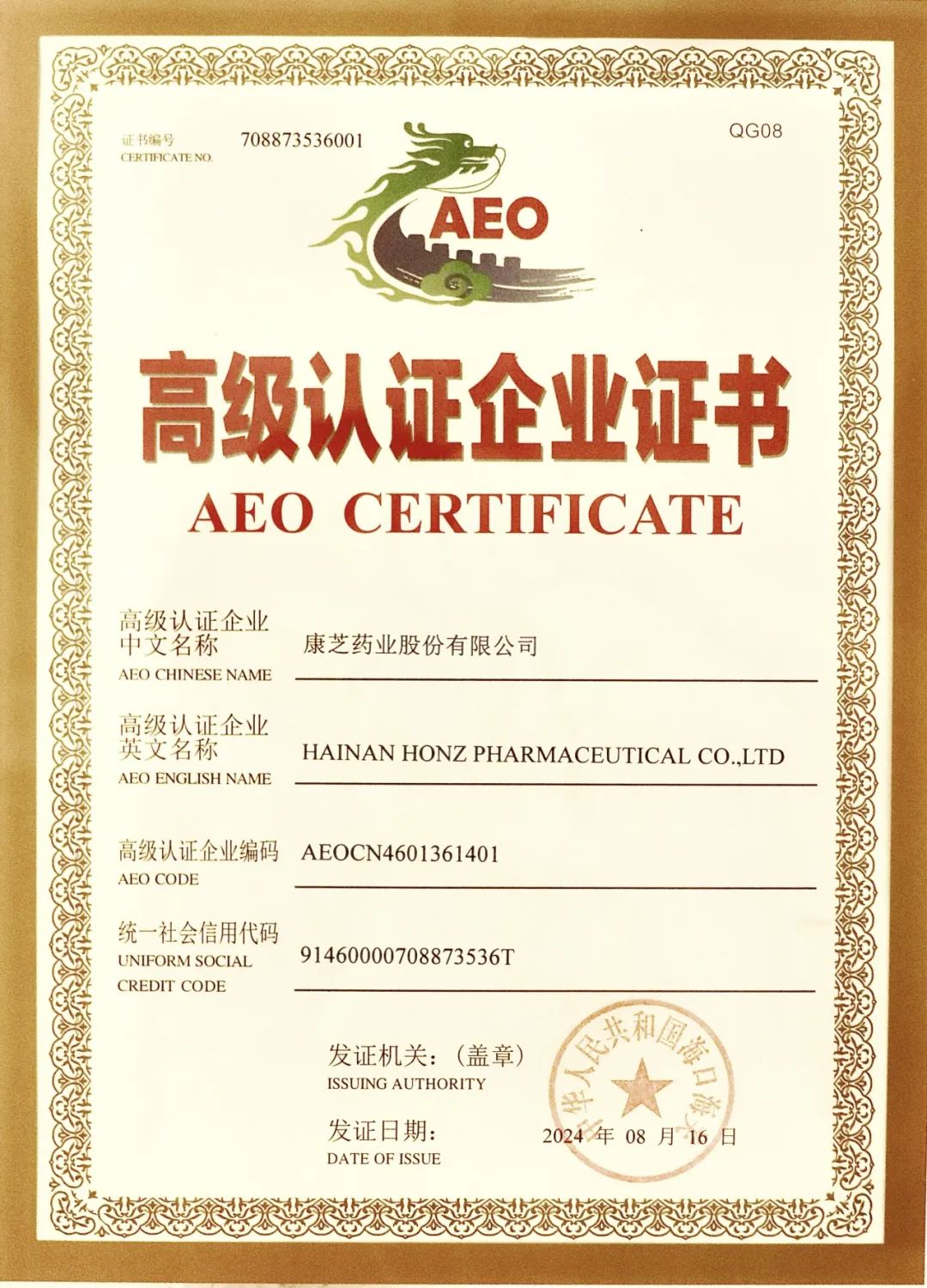 近日,康芝药业股份有限公司成功通过中国海关AEO高级认证,收到中华人民共和国海口海关颁发的《AEO高级认证企业证书》。