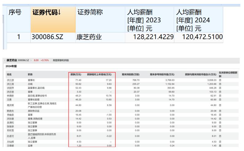 业绩的不佳也传导至员工薪酬层面。Wind数据显示,2024年,康芝药业人均薪酬为12.05万元,较2023年的12.82万元下降6.01%。与之形成对比的是,管理层薪酬呈现增长态势,2024年管理层薪酬总额为408.88万元,较2023年的378.72万元增长7.96%。具体来看,董事长洪江游薪酬为71.40万元,较上年增加17.20万元;副董事长兼副总裁洪丽萍(洪江游之妹)薪酬52.43万元,增加9.86万元;总裁洪江涛(洪江游之弟)薪酬50.82万元,增加9.63万元。在公司亏损的背景下,管理层薪酬的逆势增长引发了市场的关注与讨论。刘志耕认为,“康芝药业的薪酬结构在亏损期又加剧了分配失衡,合理性存疑。企业需建立绩效挂钩的动态调薪机制,确保高管薪酬与公司盈利正相关,平衡短期成本控制与长期人才激励,修复治理漏洞以重建信任?。”