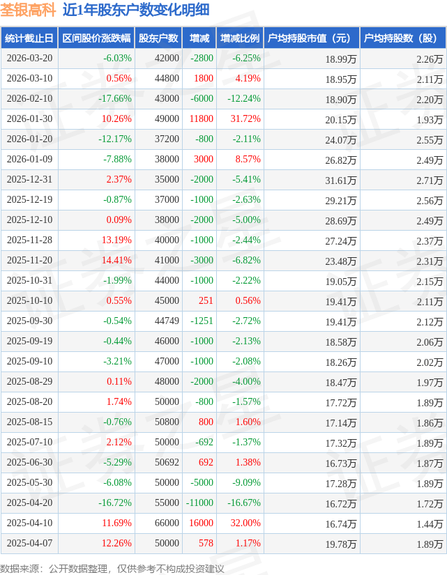 近日荃银高科披露,截至2026年3月20日公司股东户数为4.2万户,较3月10日减少2800.0户,减幅为6.25%。户均持股数量由上期的2.11万股增加至2.26万股,户均持股市值为18.99万元。