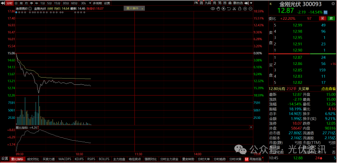 受此消息影响金刚光伏股价大跌,在开盘不到半个小时的时间内,股价一路向下,直逼跌停。