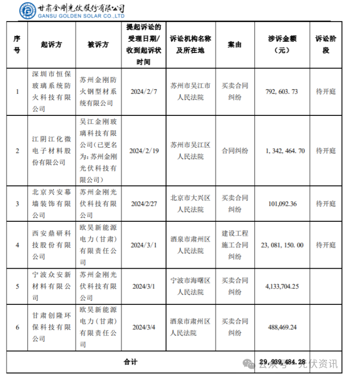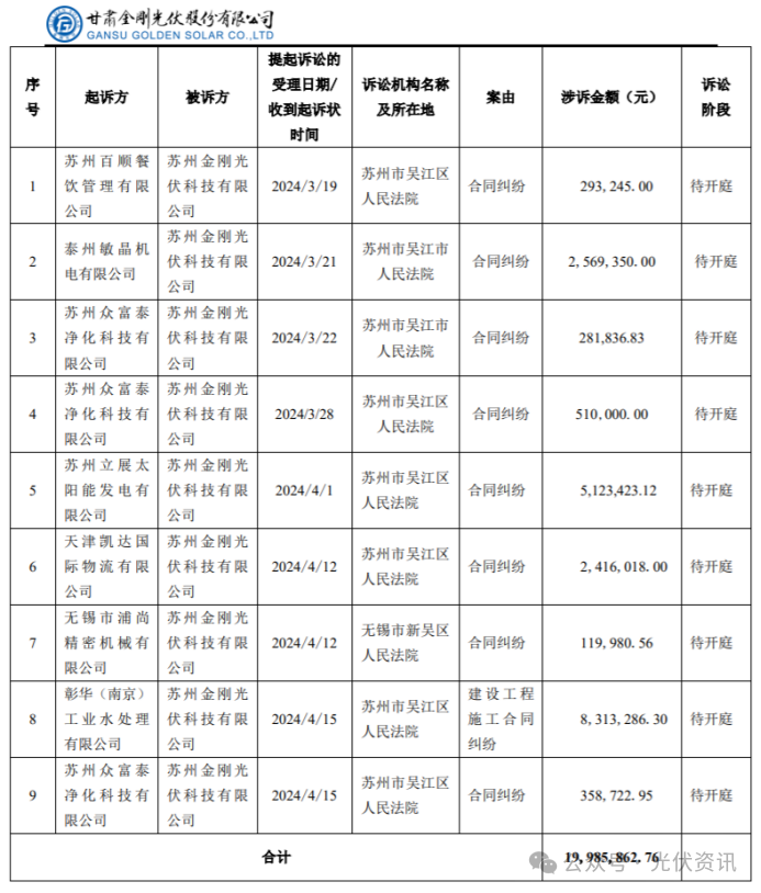 从3月19日到4月15日,不到一月的时间里。金刚光伏就7家公司起诉了9起案件,案件案由均为合同纠纷。其中苏州众富泰净化科技这一家公司就起诉了三起案件。而这些起诉、仲裁案件对公司所产生的影响,金刚光伏也给出了说明:目前部分案件尚未有产生具有法律效力的判决或裁定,对公司本期利润数或期后利润的影响存在不确定性。公司及子公司的败诉案件、以及作为被告的未判决诉讼事项可能对公司利润造成负面影响。