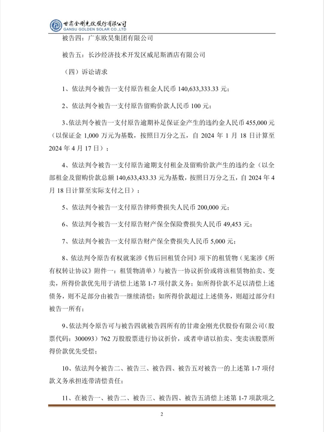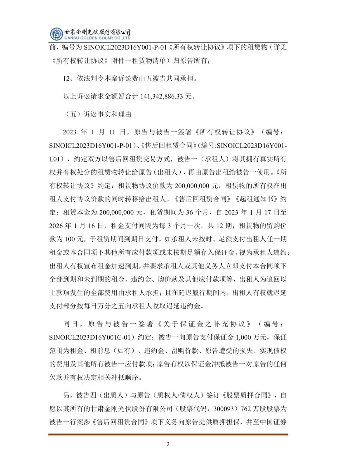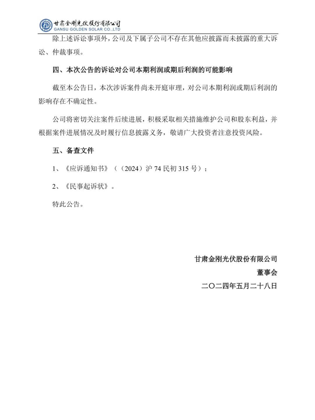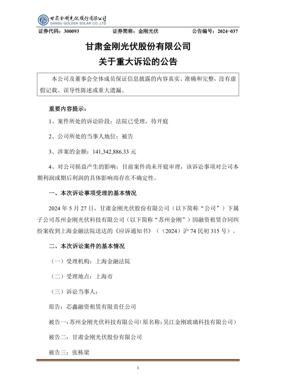 5月28日,金刚光伏发布关于重大诉讼的公告,涉案金额141,342,886.33 元。甘肃金刚光伏股份有限公司下属子公司苏州金刚光伏科技有限公司因融资租赁合同纠纷案收到上海金融法院送达的《应诉通知书》。