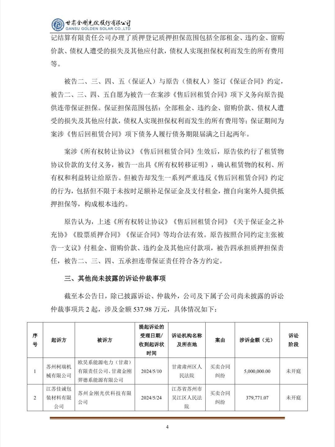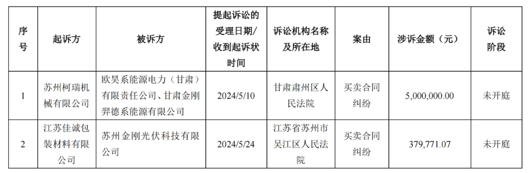 实际上,这并非金刚光伏在本月收到的第一起诉讼,在5月10日、5月24日也曾收到两起诉讼状,涉案金额超500万元人民币。