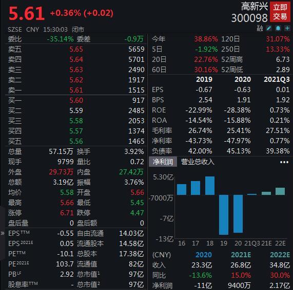 二级市场方面,高新兴22日收涨0.36%报每股5.61元,现总市值97亿元。