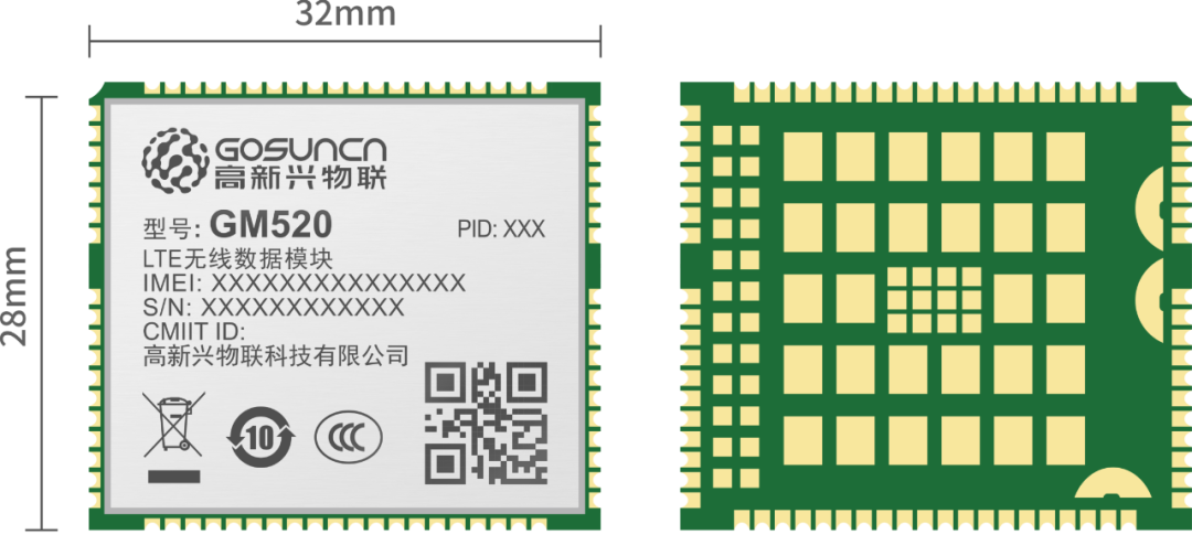 GM520模组采用了LCC+LGA 29×32mm贴片式封装,可兼容业内主流封装设计,方便用户快速实现终端方案;同时还可扩展支持Mini PCIe标准插接式封装,灵活安装;