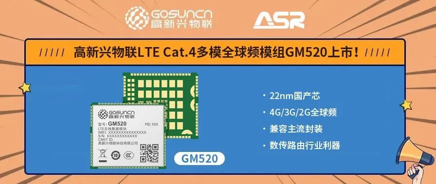 2022年3月25日,高新兴物联宣布推出新一代LTE Cat.4模组GM520,面向全球市场。GM520模组采用了翱捷科技ASR1803芯片平台,具有领先的性能和成熟可靠的产能保障,拥有优异的产品竞争力。GM520模组将与ME3630、GM510模组系列,形成面向全球市场的高品质LTE Cat.4模组产品家族。