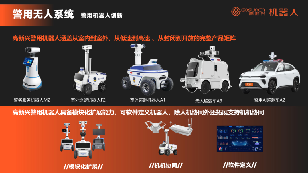 在警用巡逻领域,高新兴机器人涵盖了室内到室外、从半封闭道路到开放道路巡逻的全场景产品矩阵。根据警用场景特性,机器人具备多种处置模块拓展能力,通过机器人系统软件定义和集群部署,打造警用巡逻机器人的人机协同、多机协同及其他无人系统间机机协同的智慧新警务模式。