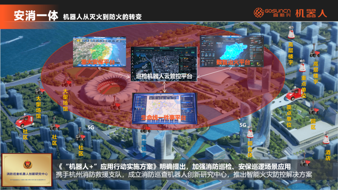 在安保服务领域,高新兴机器人构建了集安保巡逻与消防巡检于一体的室内和室外安消一体式机器人,具备“全时空、全要素、全流程”的特点,对于异常事件可实时预警,达到“早预防、早发现、早处置”,机器人可以与有人驾驶的智能微型消防车协同作业,及早处置火情隐患,提高了巡检及处置效率。目前,已与杭州消防救援支队成立了消防巡查机器人联合创新研究中心,成果已应用于杭州亚运场馆及亚运村保障。