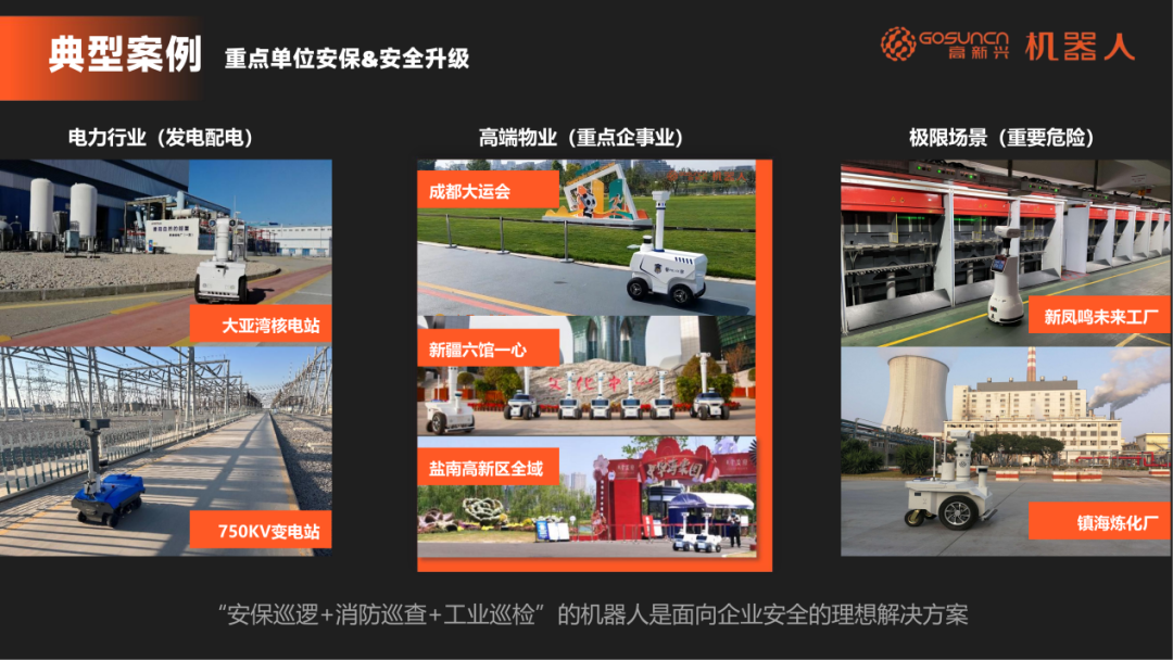 高新兴机器人以机器人为载体,向公安、安保、工业巡检三大领域提供全栈式解决方案,用机器人守护公共安全、守护生产要素安全,并持续探索更多领域的机器人创新应用。