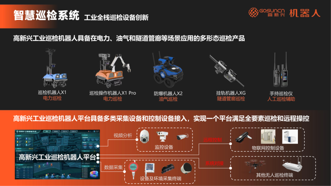 在工业巡检领域,高新兴机器人具备轮式、挂轨式、复合式及防爆等多种形态特性的巡检机器人产品,应用场景覆盖电力、能源及隧道、管廊等高危高安全等级场景,并基于立体巡检目标为客户提供地空协同、高低联动、动静融合、虚实结合、数智化运维等能力于一体的孪生智能平台,实现重要场景的多维度、全要素的人机协同巡检、可视化应急处置、数智化全息巡检。