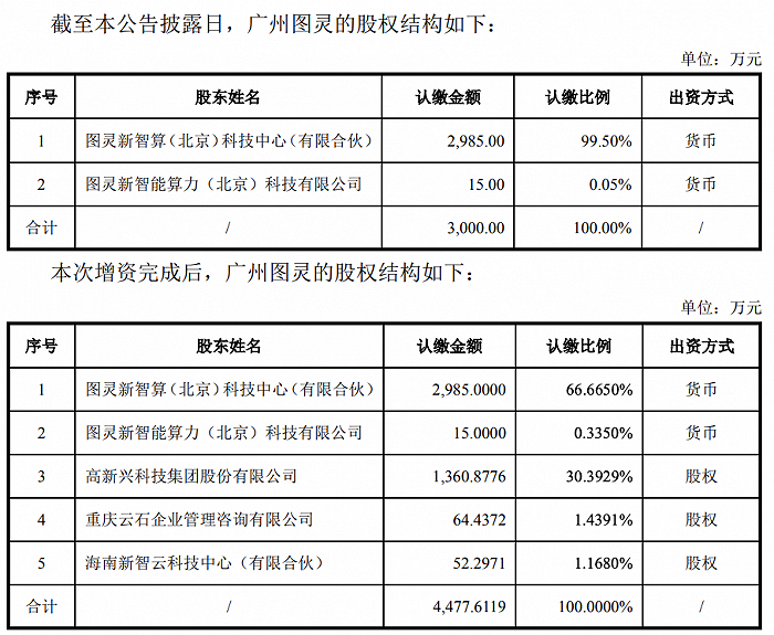 股权结构来看,本次增资前,图灵新智算(北京)科技中心(有限合伙)(以下简称:图灵有限合伙)、图灵新智能算力(北京)科技有限公司(以下简称:图灵新智算)分别持有广州图灵99.50%和0.05%的股份。