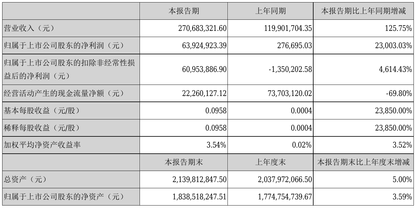 挖贝网8月25日,精准信息(300099)近日发布2021年半年度报告,报告期内营业收入270,683,321.60元,同比增加125.75%;净利63,924,923.39元,同比净利增加23,003.03%。