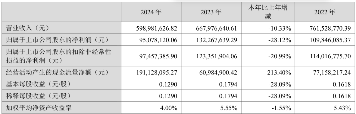 2024年,尤洛卡实现营业收入5.99亿元,同比下降10.33%;归属于上市公司股东的净利润9507.81万元,同比下降28.12%;归属于上市公司股东的扣非净利润9745.74万元,同比下降20.99%;经营活动产生的现金流量净额为1.91亿元,同比增长213.40%。