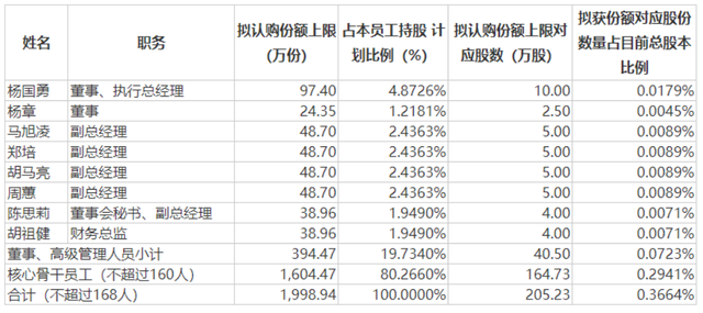 公告显示,参加本员工持股计划的员工总人数不超过168人,其中董事(不含独立董事)、高级管理人员为8人,本员工持股计划参加对象及认购份额的情况如下所示: