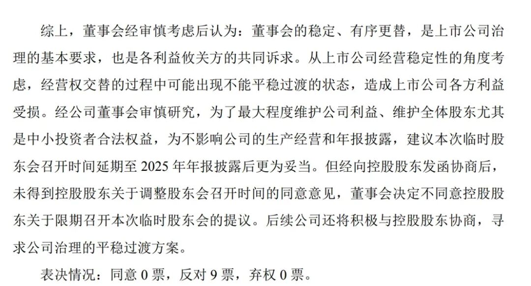 一是提前更换全体现任董事将影响公司2025年年报披露。公司已于2025年12月更换年度会计师事务所,年报审计工作较往年已有所推迟,现审计工作正初步展开。提前更换全体现任董事,可能将影响年报的正常编制及披露进程。