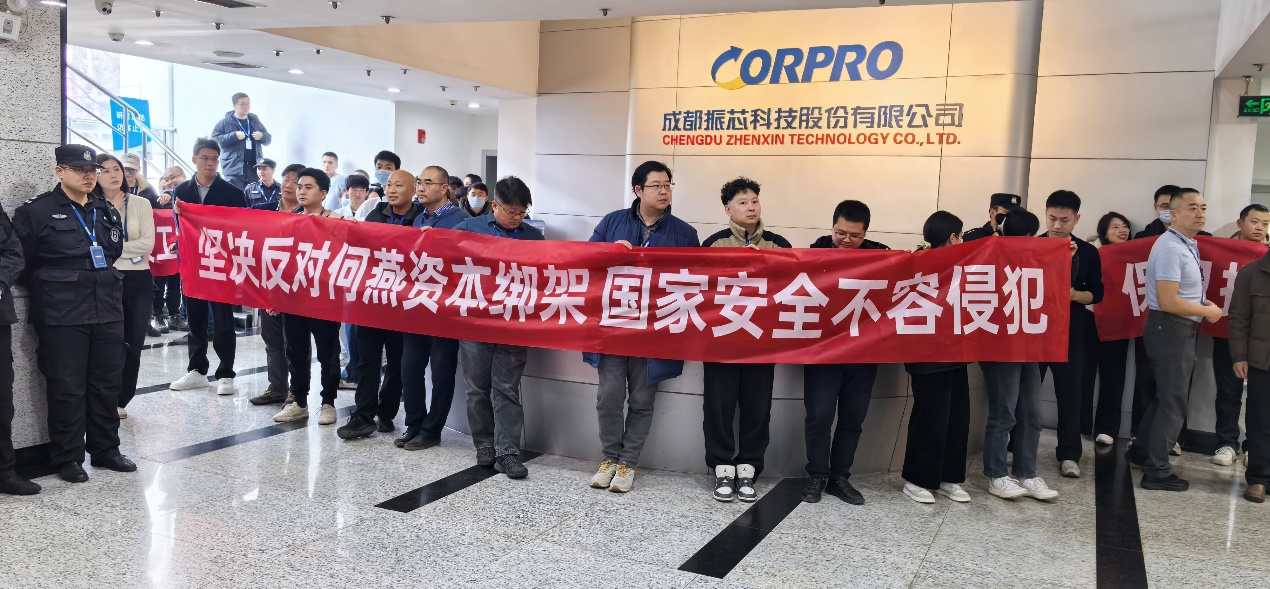 2月12日下午,振芯科技的员工在公司大楼抗议实际控制人何燕“资本绑架”张晓晖/摄