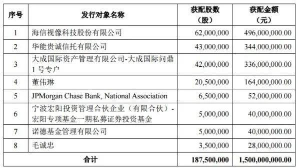 参与申购的投资者共有28名,最终花落8家。在这8位特定发行对象中,海信视像(600060.SH,以下简称海信)傲视群雄,“顶格”获配6200万股,获配金额达4.96亿元,位居定增榜首。华能信托、大成国际、JP Morgan Chase Bank(摩根大通)、宏阳投资、诺德基金等知名投资机构亦在其中。