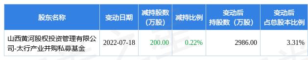 7月18日乾照光电发布公告《乾照光电:简式权益变动报告书》,其股东山西黄河股权投资管理有限公司-太行产业并购私募基金于2022年7月18日合计减持200.0万股,占公司目前总股本的0.2215%,变动期间该股股价上涨3.63%,截止7月18日收盘报7.14元。