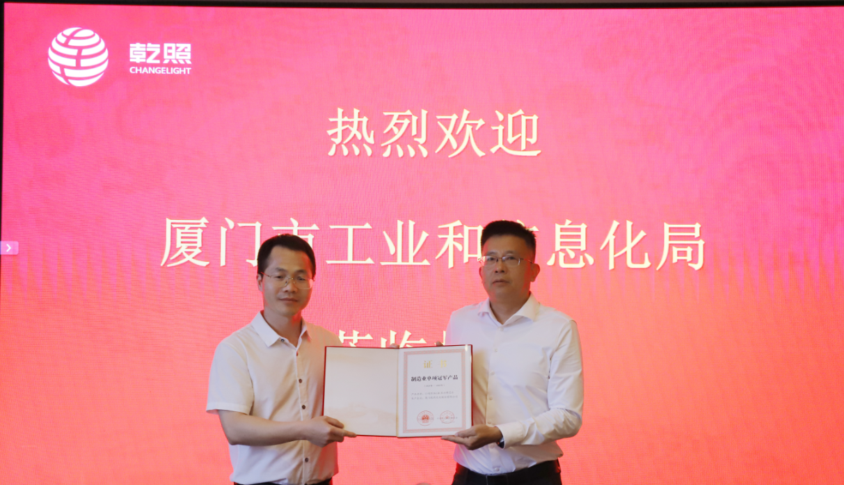陈秉佳处长、邱忠强二级调研员一行在公司展厅听取了关于公司生产经营、产品应用等情况的介绍。随后在会议室,双方进行了授牌仪式。陈秉佳处长指出,此次厦门共有4家企业的产品成为新一批单项冠军产品,截至目前,厦门已有14个企业(产品)被认定为国家级制造业单项冠军。因此,乾照光电能够获此殊荣,实属不易也证明了企业的实力。希望企业再接再厉,制造出更多的“冠军产品”。