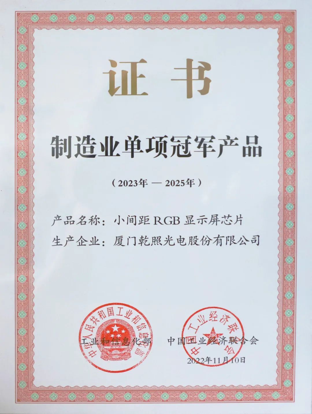 据悉,制造业单项冠军被誉为制造业皇冠上的“明珠”,包括单项冠军示范企业和单项冠军产品两类,是指长期专注于制造业某些特定细分产品市场,生产技术或工艺国际领先,单项产品市场占有率位居全球前列的企业和产品。乾照光电此次入选单项冠军名单的产品——小间距RGB显示屏芯片,攻克了小间距LED显示的诸多技术瓶颈,光电转换效率、可靠性、半波宽等关键性能指标均处于同类产品的国际领先水平。被广泛用于家用显示、专业显示、商业显示、租赁显示、体育显示和创意显示等显示领域。
