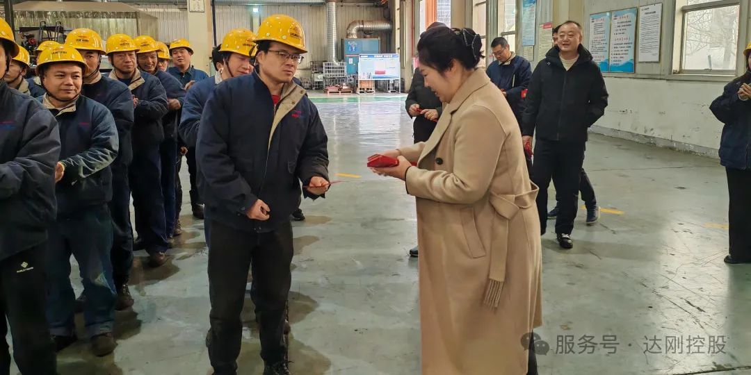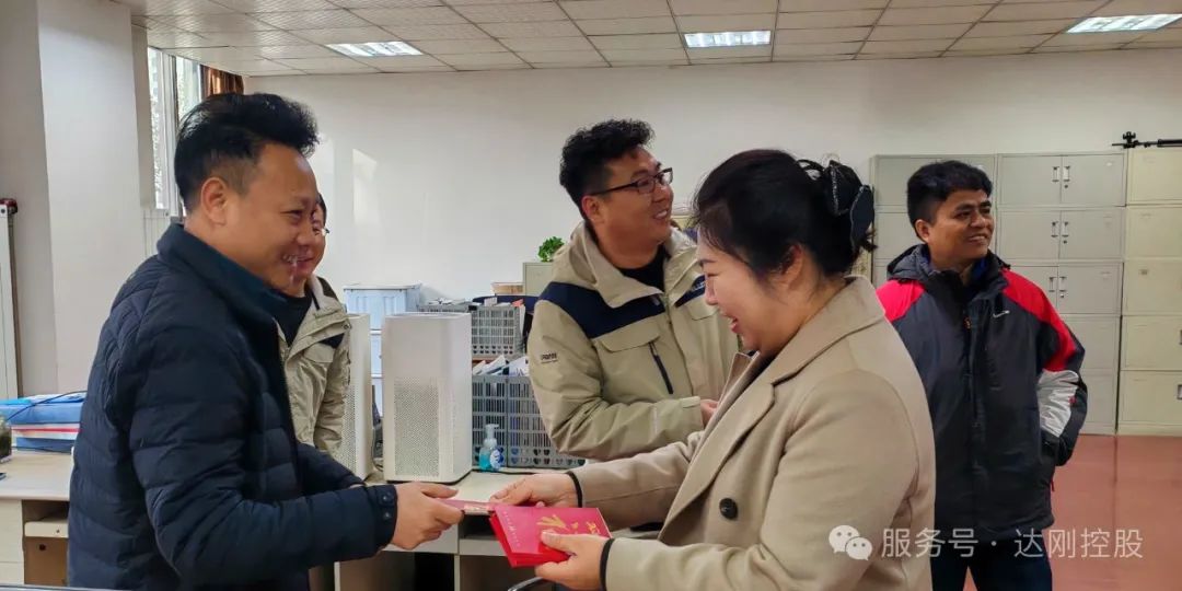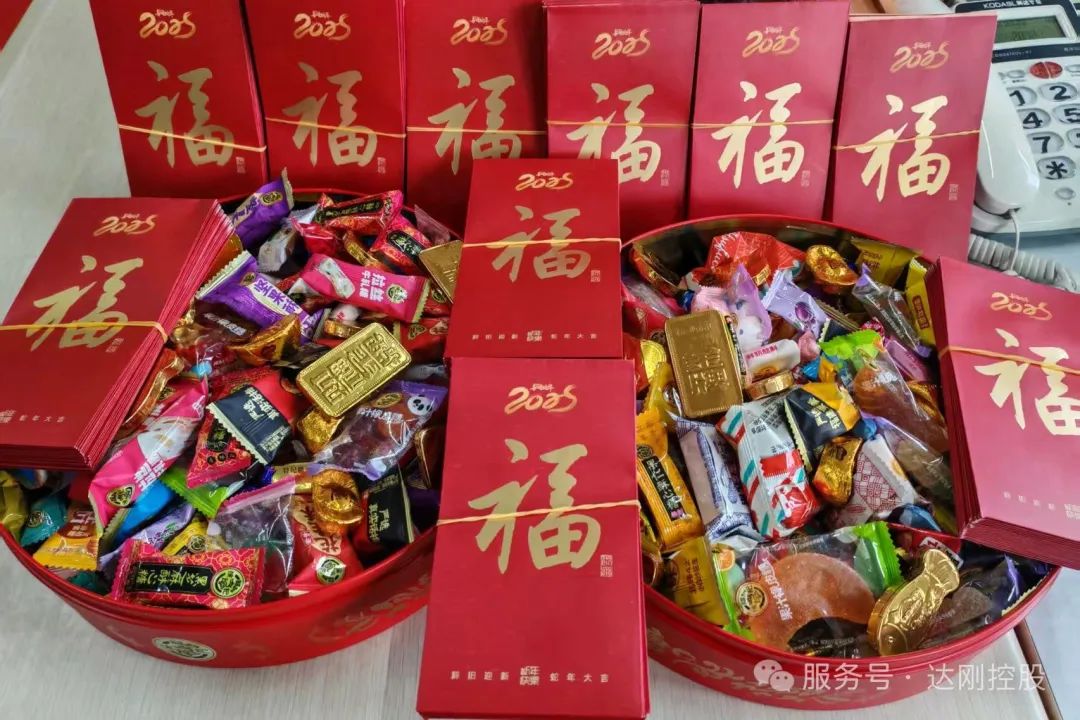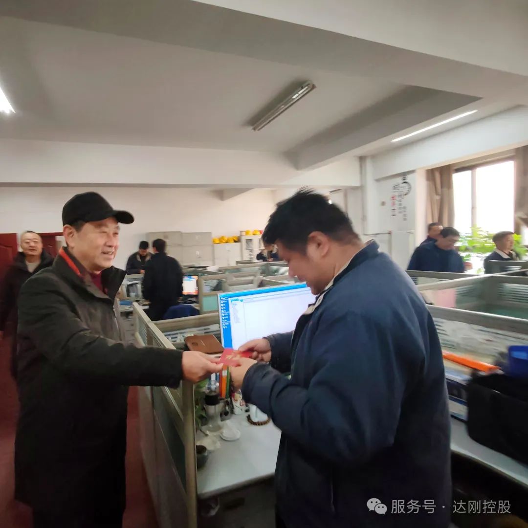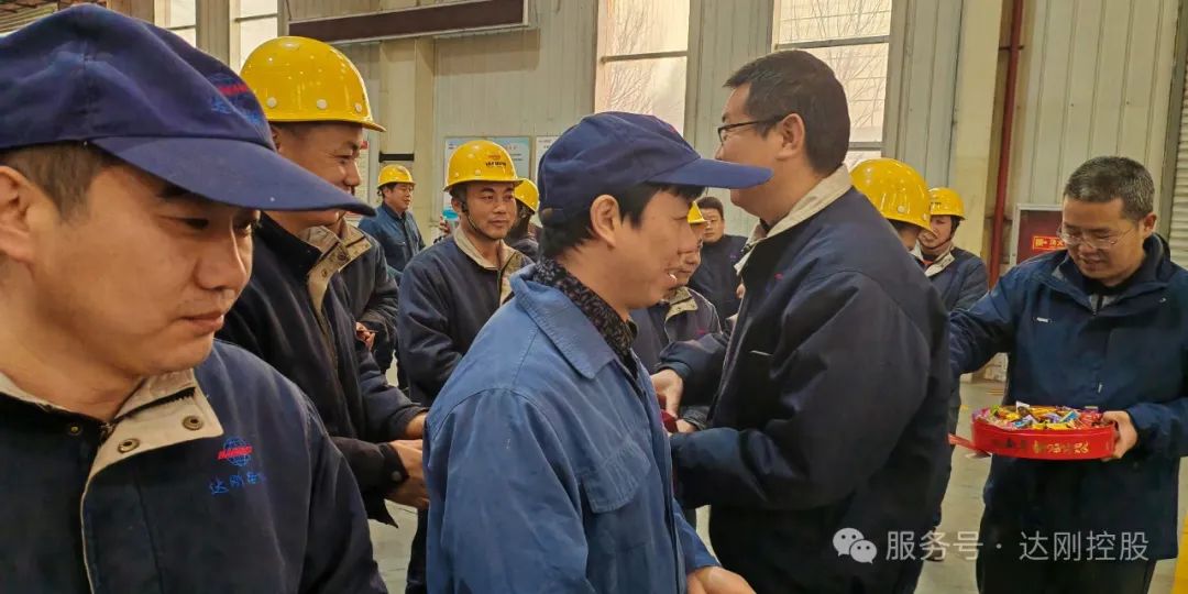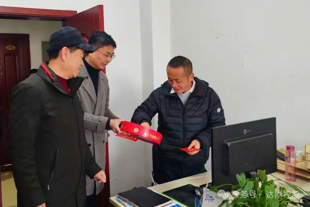 达刚股份集团总裁王妍携管理层,向高端装备总装基地各部门全员致以新春的问候与祝福,寄予新年新征程的期许,并送上喜庆的糖果和红包,象征着对大家新年美好诚挚的祝福。