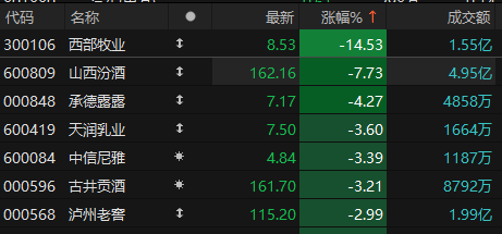8月28日早盘,食品饮料板块震荡走低。截至9时37分,西部牧业跌超14%,山西汾酒跌逾7%,天润乳业、古井贡酒、泸州老窖等跟跌。