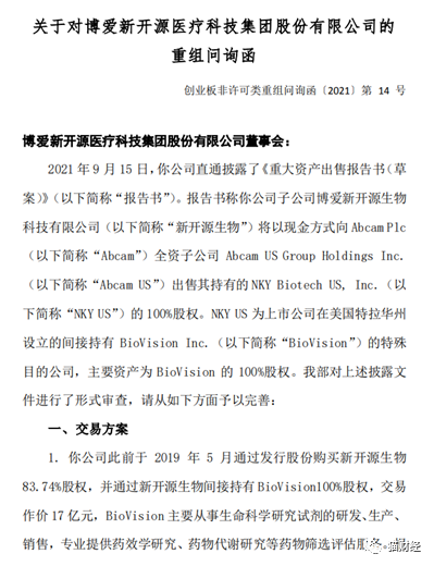 9月27日,深交所创业板公司管理部向新开源下发重组问询函,要求公司结合BioVision的实际经营状况、行业发展状况、境外业务开展的相关风险说明收购BioVision形成商誉是否存在减值风险,以前年度未计提商誉减值准备的合理性,通过出售BioVision规避公司商誉减值风险的合理性与必要性。