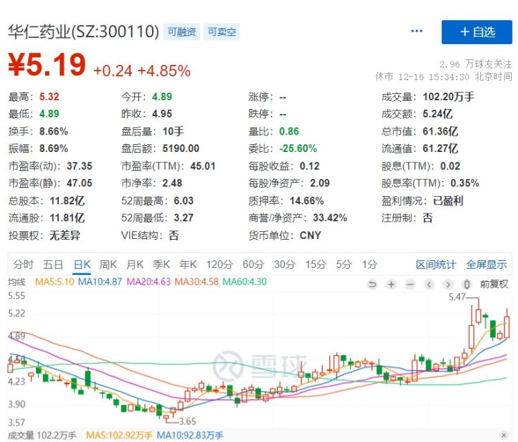 二级市场上,华仁药业近期因电解质水产品走俏关注度增长,18日收报4.85%,股价5.19元。