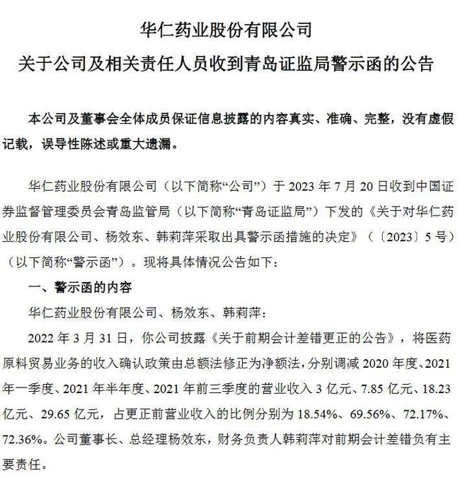 警示函显示,2022年3月31日,华仁药业披露《关于前期会计差错更正的公告》,将医药原料贸易业务的收入确认政策由总额法修正为净额法,分别调减2020年度、2021年一季度、2021年半年度、2021年前三季度的营业收入3亿元、7.85亿元、18.23亿元、29.65亿元,占更正前营业收入的比例分别为18.54%、69.56%、72.17%、72.36%。公司董事长、总经理杨效东,财务负责人韩莉萍对前期会计差错负有主要责任。